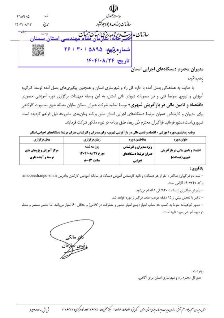 به اطلاع می رساند سازمان مدیریت و برنامه ریزی استان سمنان در نظر دارد نسبت به برگزاری سمینار آموزشی با عنوان “اقتصاد و تامین مالی در بازآفرینی شهری در تاریخ  ۲۷ آبان ماه  ۱۴۰۴  ویژه مدیران و کارشناس عمران مرتبط دستگاه های اجرایی اقدام نماید. متقاضیان می توانند جهت کسب اطلاعات بیشتر به نامه شماره ۴۱۸۹۰۵مورخ ۱۳/۸/۱۴۰۴ در سایت سازمان مراجعه نمایند.