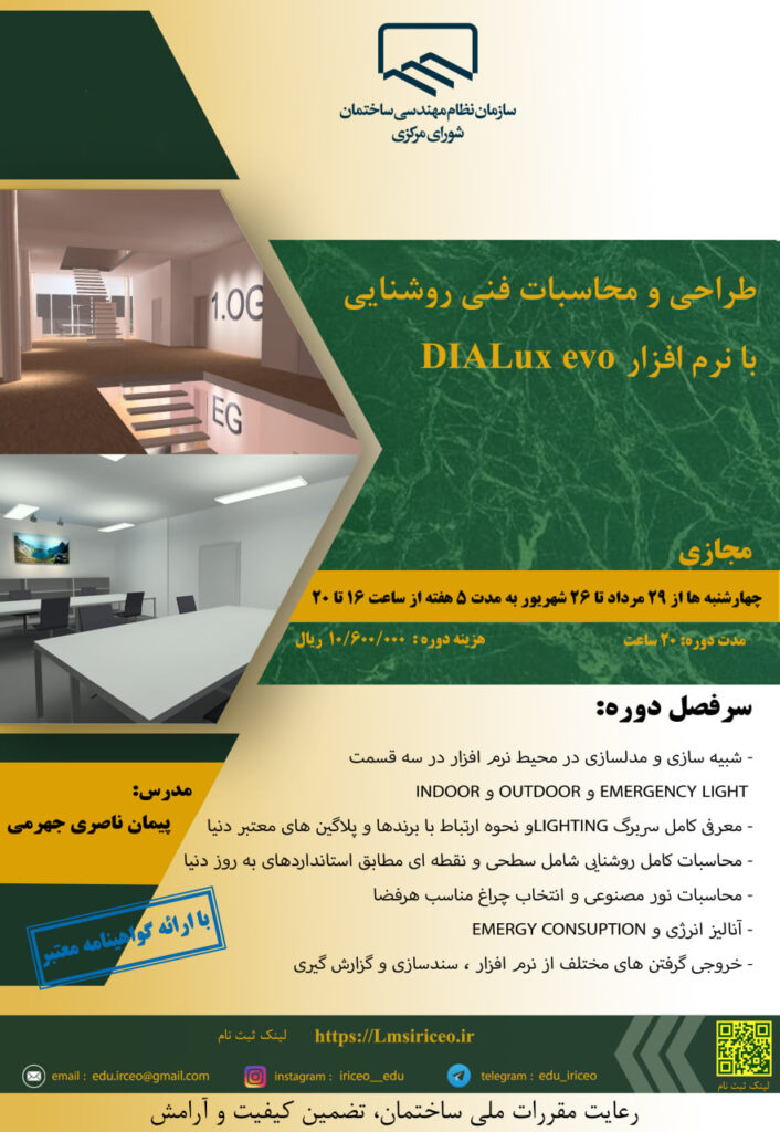 به اطلاع می رساند سازمان نظام مهندسی ساختمان (شورای مرکزی) در نظر دارد نسبت به برگزاری وبینار آموزشی مجازی با عنوان “طراحی و محاسبات فنی روشنایی با نرم افزار DIALux evoدر تاریخ  ۹ مرداد ماه  و ۵، ۱۲، ۱۹ و ۲۶ شهریور ماه ۱۴۰۴ اقدام نماید. متقاضیان می توانند جهت کسب اطلاعات بیشتر به نامه شماره ۶۶۵۸۳/ش­م مورخ ۱۴۰۴/۰۵/۰۵ در سایت سازمان مراجعه نمایند.