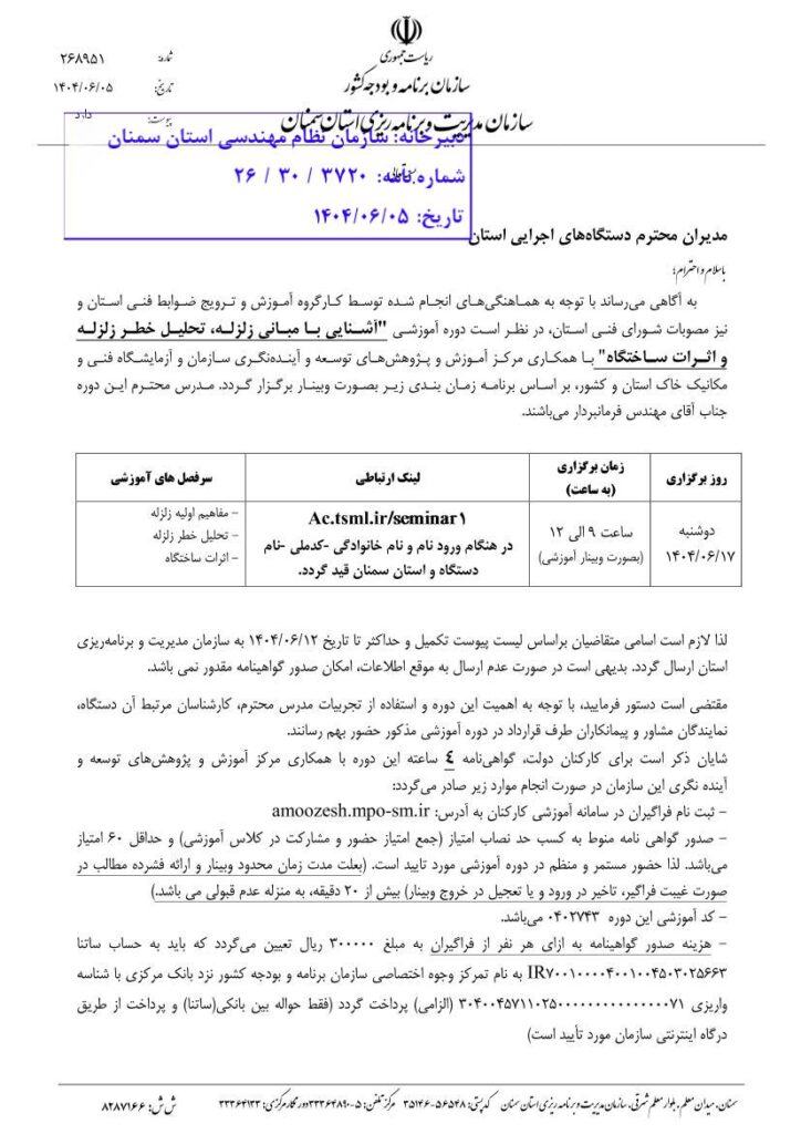 به اطلاع می رساند سازمان مدیریت و برنامه ریزی استان سمنان در نظر دارد نسبت به برگزاری وبینار آموزشی مجازی با عنوان “آشنایی با زلزله و تحلیل خطردر تاریخ  ۱۷شهریور ماه  ۱۴۰۴ اقدام نماید. متقاضیان می توانند جهت کسب اطلاعات بیشتر به نامه شماره ۲۶۸۹۵۱ مورخ ۵/۶/۱۴۰۴ در سایت سازمان مراجعه نمایند.