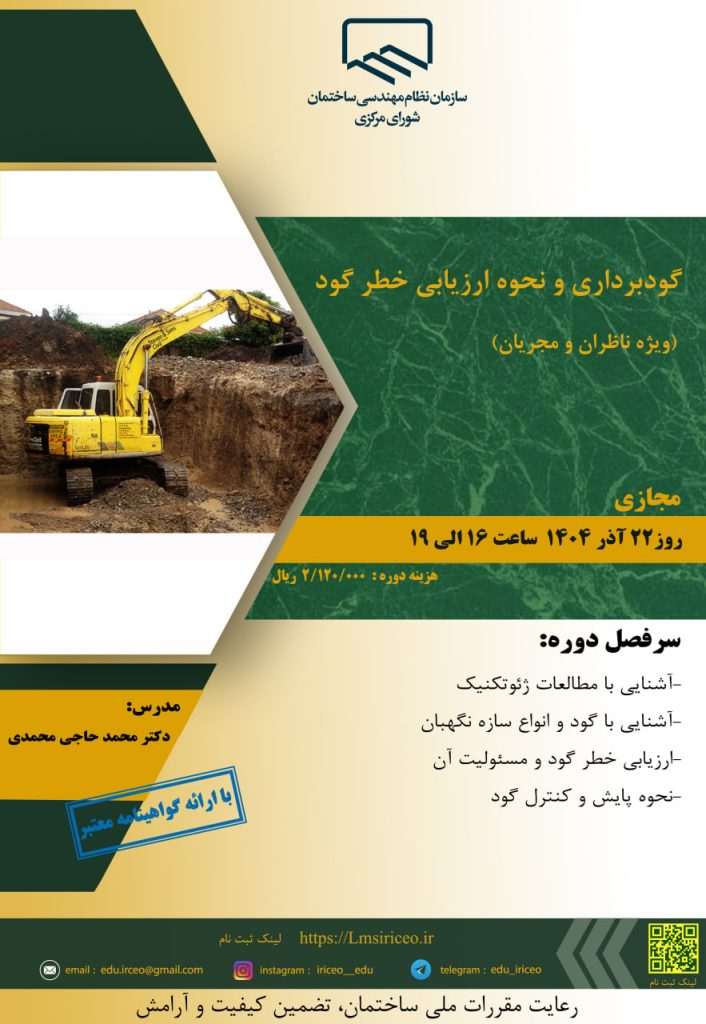 به اطلاع می رساند سازمان نظام مهندسی ساختمان کشور در نظر دارد نسبت به برگزاری سمینار آموزشی با عنوان “گودبرداری و نحوه ارزیابی خطر گود در تاریخ  ۲۲ آذر ماه  ۱۴۰۴  ویژه ناظران و مجریان اقدام نماید. متقاضیان می توانند جهت کسب اطلاعات بیشتر به نامه شماره ۶۴۱۰۹ مورخ  ۲۷/۸/۱۴۰۴ در سایت سازمان مراجعه نمایند.