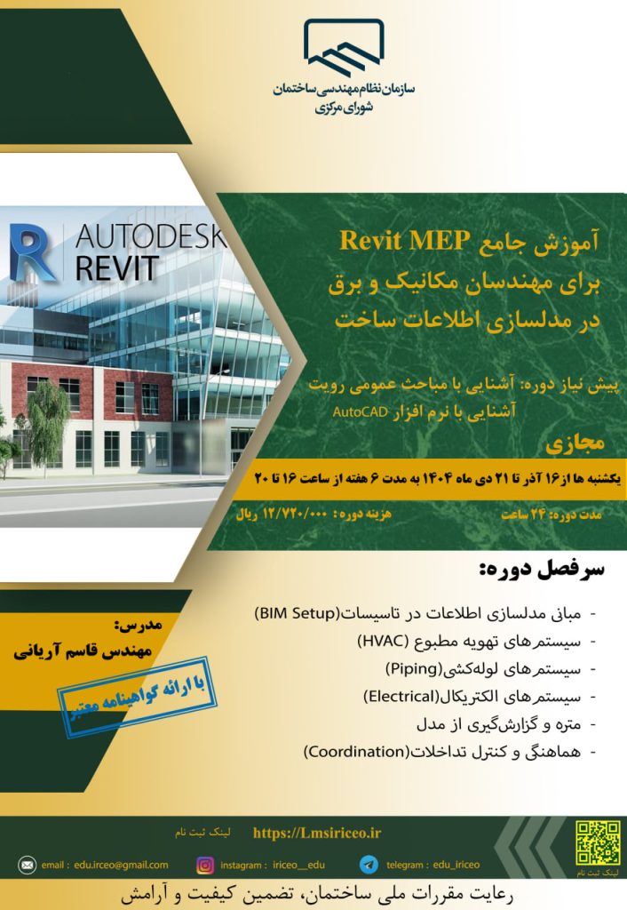 به اطلاع می رساند سازمان نظام مهندسی ساختمان کشور در نظر دارد نسبت به برگزاری دوره آموزشی با عنوان “آموزش جامعREVIT MEP برای مهندسان مکانیک و برق از تاریخ  ۱۶ آذر ماه  ۱۴۰۴  بمدت ۶ هفته اقدام نماید. متقاضیان می توانند جهت کسب اطلاعات بیشتر به نامه شماره ۶۴۱۰۹ مورخ  ۲۷/۸/۱۴۰۴ در سایت سازمان مراجعه نمایند.