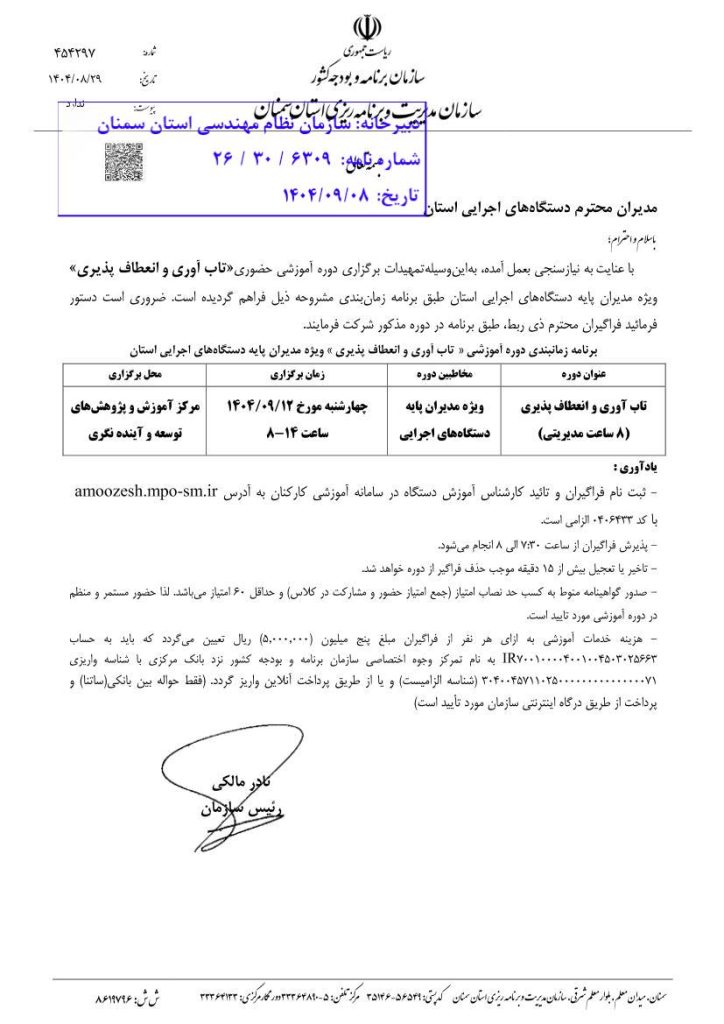 به اطلاع می رساند سازمان مدیریت و برنامه ریزی استان سمنان در نظر دارد نسبت به برگزاری سمینار آموزشی با عنوان “تاب آوری و انعطاف پذیری” در تاریخ ۱۲ آذر ماه ۱۴۰۴ ویژه مدیران پایه اقدام نماید. متقاضیان می توانند جهت کسب اطلاعات بیشتر به نامه شماره ۴۵۴۲۹۷ مورخ ۲۹/۸/۱۴۰۴ در سایت سازمان مراجعه نمایند.