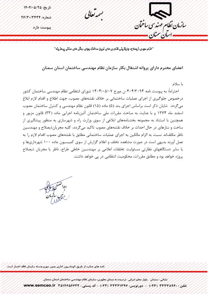 * به پیوست جلوگیری از اجرای عملیات ساختمانی برخلاف نقشه‌های مصوب