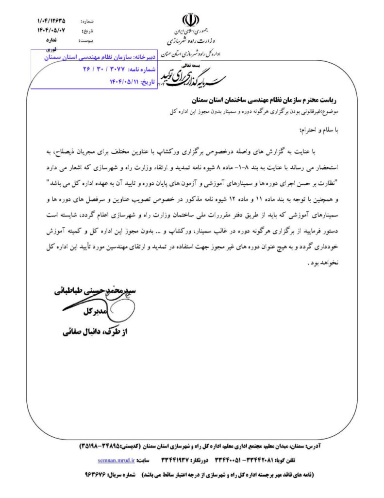 * عطف به غیر قانونی بودن برگزاری هر گونه دوره و سمینار بدون مجوز این اداره کل- برگزاری دوره ها توسط انجمن مجریان