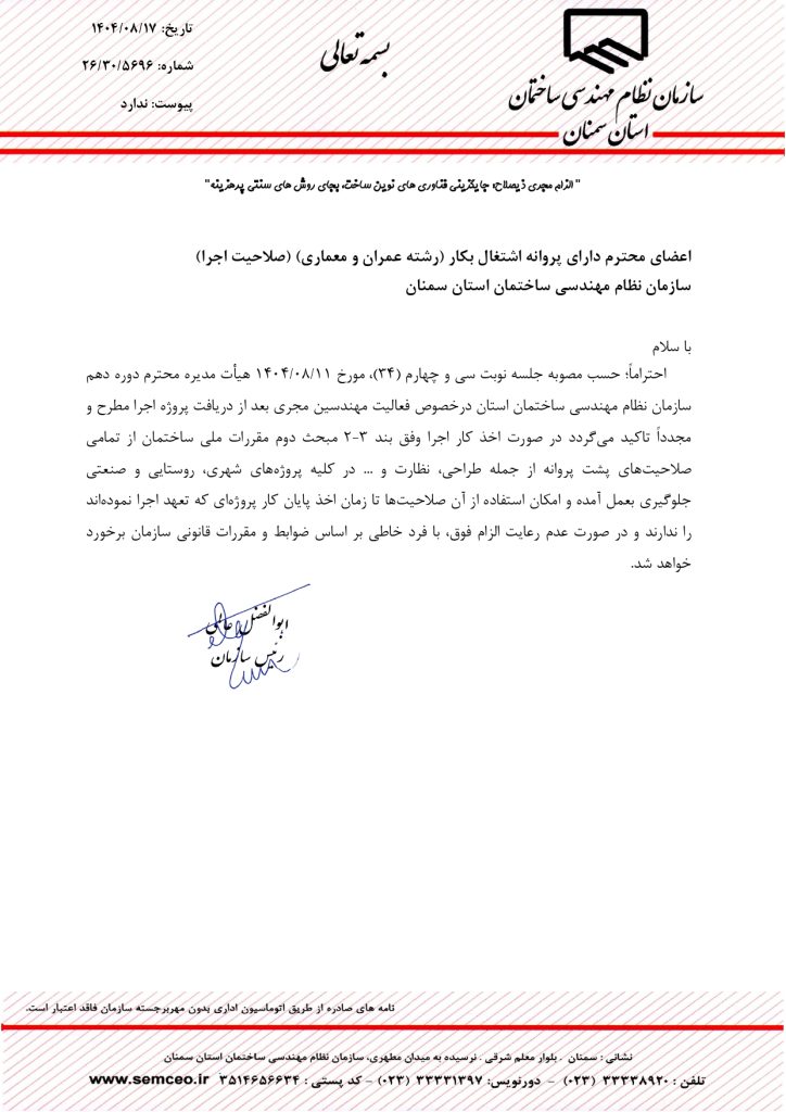 Home»نوشته‌ها»ابلاغیه ها, اخبار»* عدم امکان استفاده از پروانه اشتغال طراحی و نظارت در تمامی پروژه‌های شهری، روستایی و صنعتی