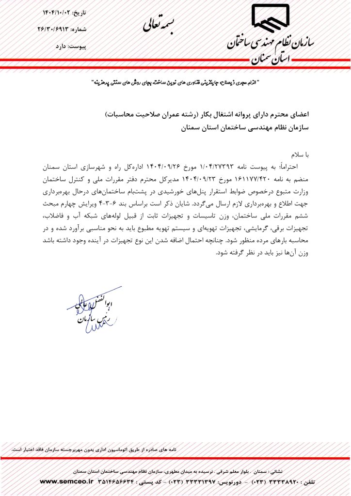 * ضوابط استقرار پنل های خورشیدی در پشت بام های ساختمان های در حال بهره برداری