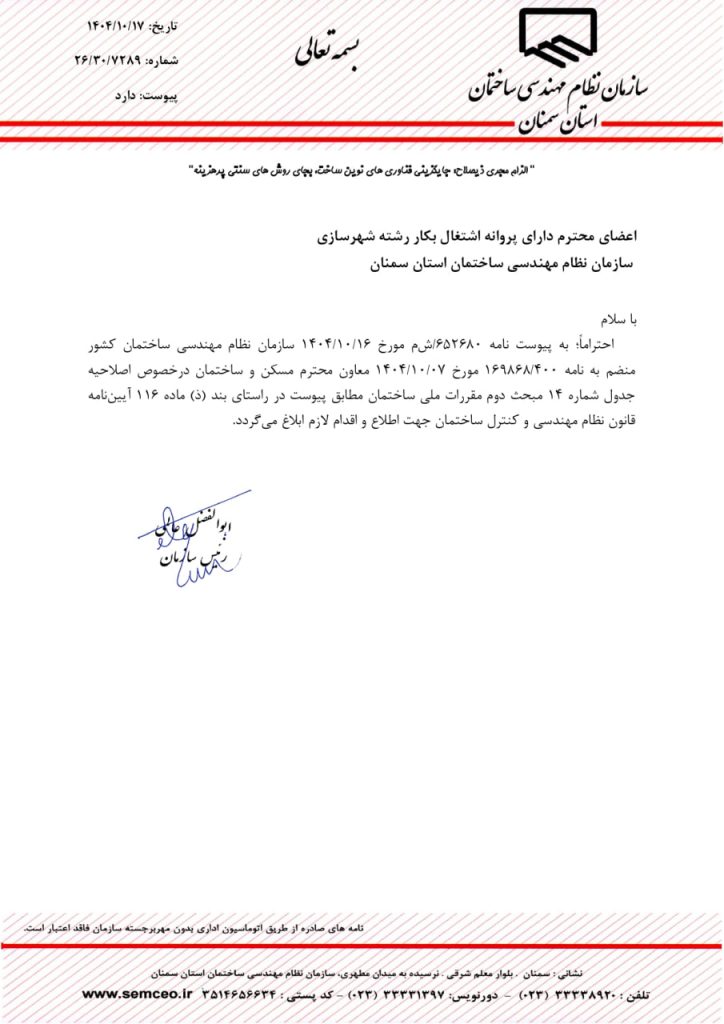 Home»نوشته‌ها»ابلاغیه ها, اخبار»* به پیوست ابلاغ جدول شماره 14 مبحث دوم مقررات ملی ساختمان