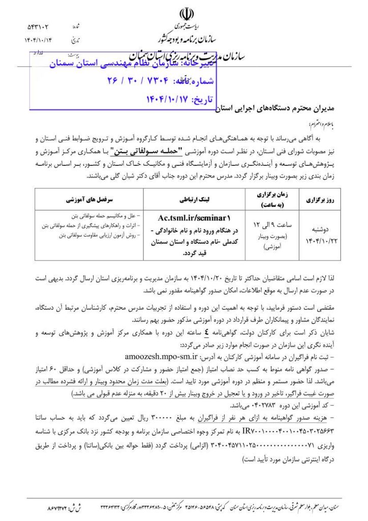 به اطلاع می رساند سازمان مدیریت و برنامه ریزی استان سمنان، در نظر دارد نسبت به برگزاری دوره آموزشی با عنوان “حمله سولفاتی بتن” در تاریخ 22/10/1404 بصورت وبینار آموزشی اقدام نماید. متقاضیان می توانند جهت کسب اطلاعات بیشتر به نامه شماره 543102 مورخ 14/10/1404 در سایت سازمان مراجعه نمایند.