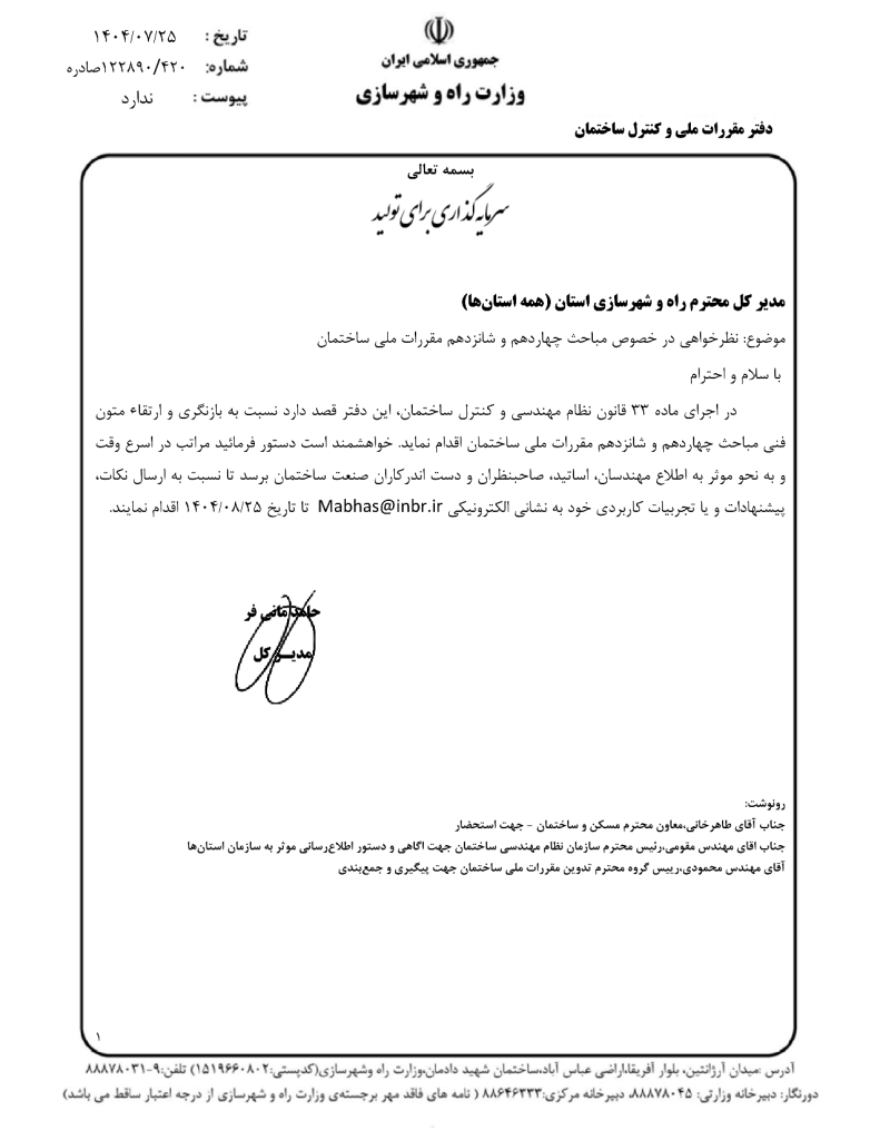 * نظرخواهی در خصوص مباحث چهاردهم و شانزدهم مقررات ملی ساختمان