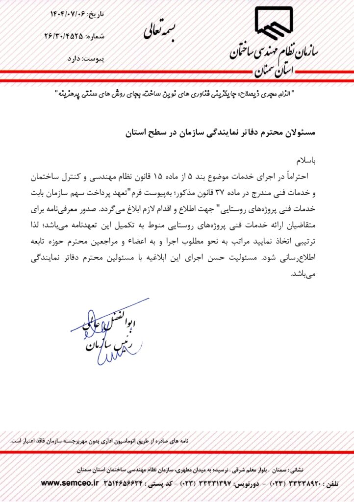Home»نوشته‌ها»ابلاغیه ها, اخبار, اخبار ویژه»* ابلاغ فرم “تعهد پرداخت سهم سازمان بابت خدمات فنی پروژه های روستایی” به دفاتر نمایندگی