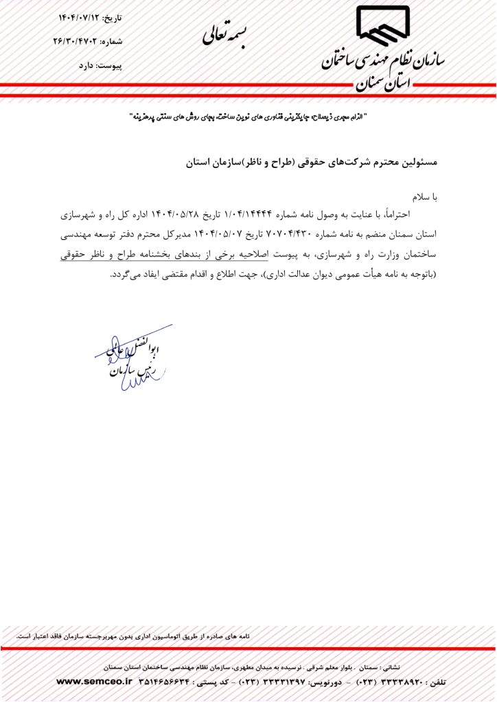 * اعلام اصلاحیه بخشنامه طراح و ناظر حقوقی (راه و شهرسازی سمنان- شرکتهای حقوقی طراح و ناظر استان سمنان)