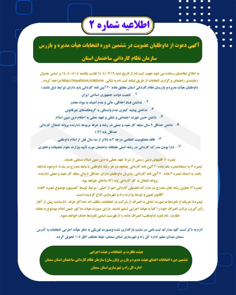 * اطلاعیه شماره ۲ انتخابات اعضای هیئت مدیره و بازرسان سازمان نظام کاردانی ساختمان استان سمنان
