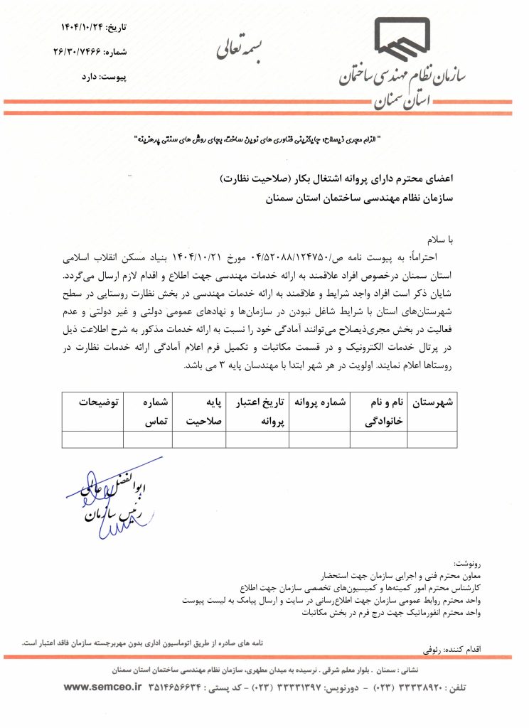 فراخوان افراد واجد شرایط جهت ارائه خدمات مهندسی در بخش نظارت روستایی