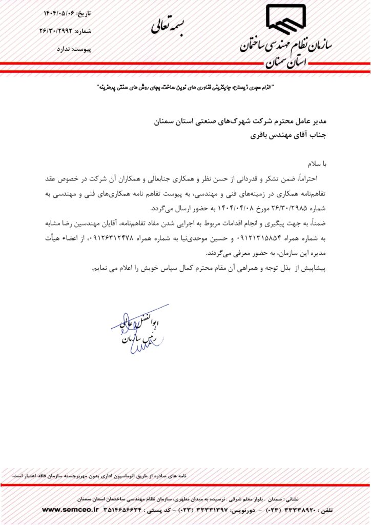 * تفاهم نامه همکاری با شرکت شهرکهای صنعتی استان سنان